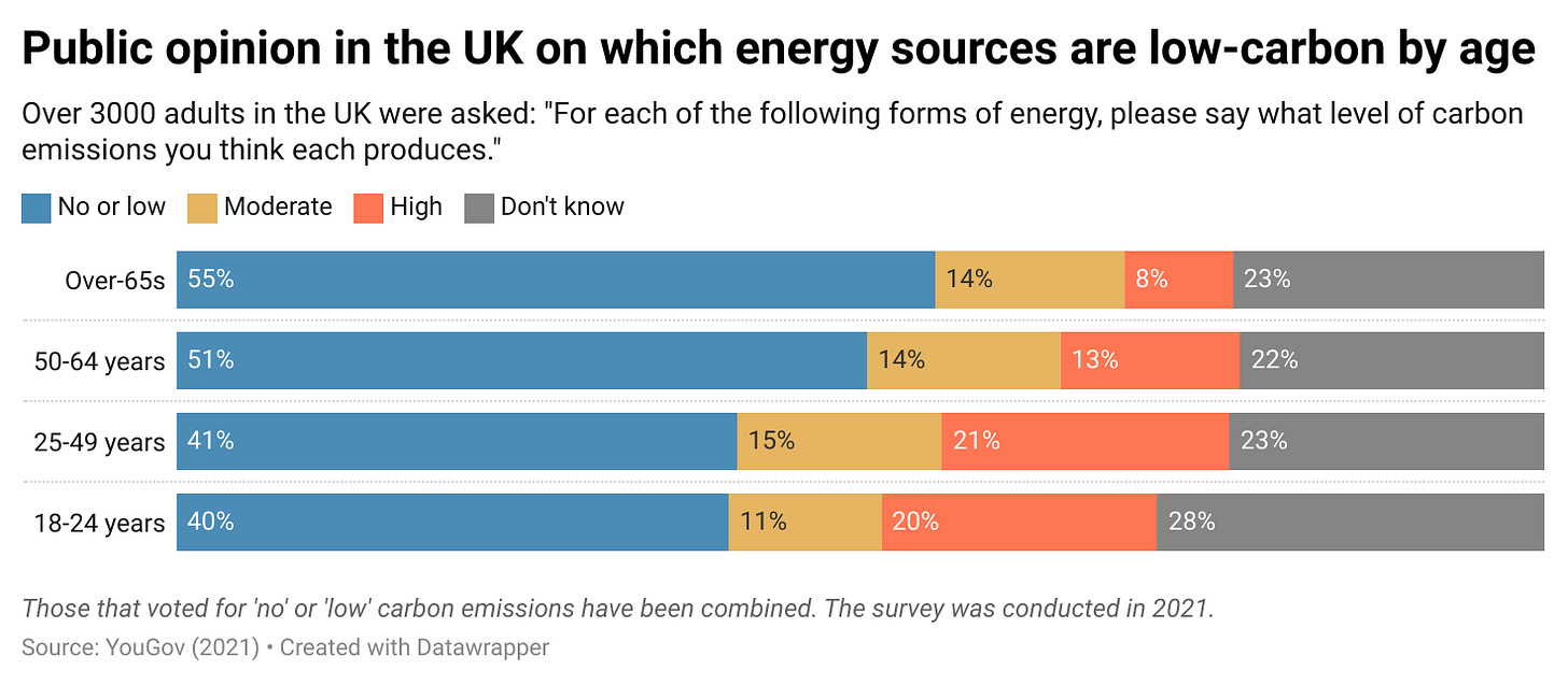 Older people are more likely to say that nuclear is low-carbon. In the chart below I’ve shown the age breakdown from the 2021 YouGov survey.