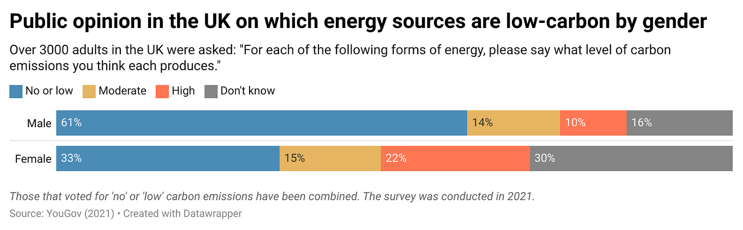 Most surveys also find a strong gender divide. Men are more likely to say that nuclear is low-carbon. In the YouGov survey, 61% of men thought so, compared to 33% of women. The IMechE survey found a similar gap: 60% for men, and 36% for women.